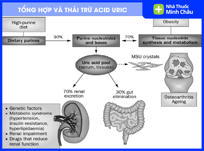 Giảm đào thải qua thận: Đây là nguyên nhân phổ biến nhất. Thận bị suy yếu hoặc bị cản trở bởi các loại thuốc, bệnh lý nền khiến nó không thể lọc sạch acid uric khỏi máu.