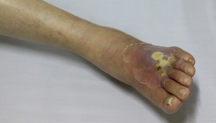 Hình ảnh bàn chân tiểu đường bị nhiễm trùng với tình trạng loét và mưng mủ.