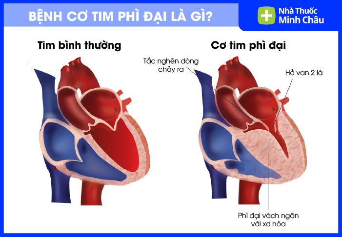 Cơ tim phì đại là tình trạng các sợi cơ tim dày lên bất thường, chủ yếu tại vách liên thất (vách ngăn giữa hai buồng tim). Khi thành tim dày, buồng thất trái bị thu hẹp, cản trở dòng máu đi ra ngoài, làm tim phải co bóp mạnh hơn để đẩy máu.