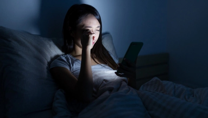 Thiếu ngủ và tiếp xúc quá nhiều với ánh sáng xanh từ điện thoại có thể làm mệt mỏi vùng mắt, góp phần hình thành bọng mắt.