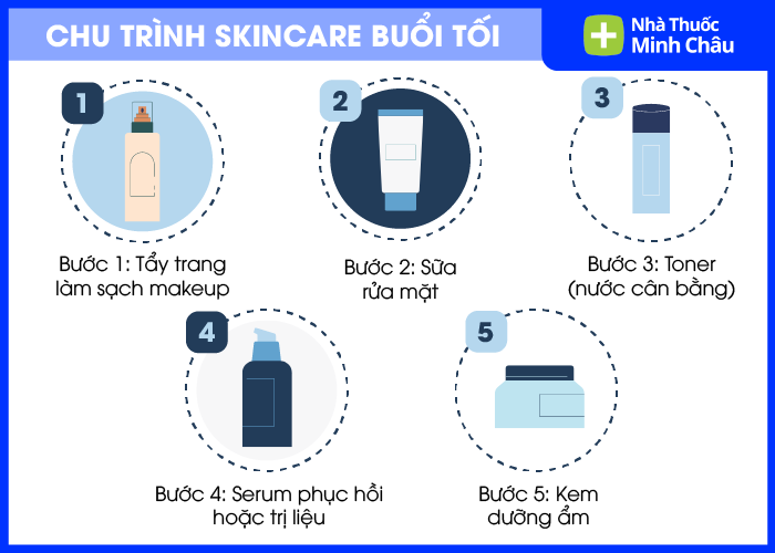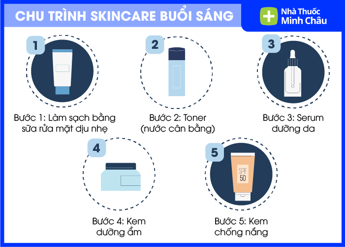 Buổi sáng khoảng 5 bước: rửa mặt – toner – serum – kem dưỡng – kem chống nắng. Buổi tối 5 bước: tẩy trang – rửa mặt – toner – serum – kem dưỡng.