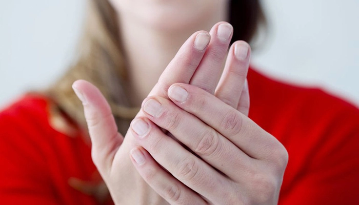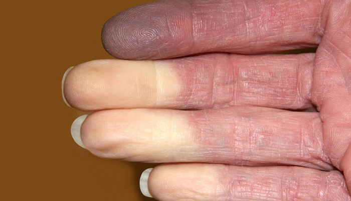 Bàn tay của người mắc Hội chứng Raynaud, một rối loạn co thắt mạch máu ngoại vi gây giảm lưu lượng máu đến các chi và khiến tay chân lạnh.