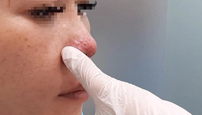 Dấu hiệu: Sống mũi trắng bệch hoặc đầu mũi đỏ tấy do áp lực sụn đè nén lên mao mạch lâu ngày.