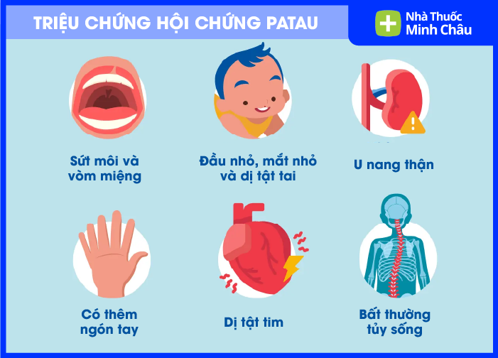 Trẻ mắc Patau thường có nhiều dị tật phức tạp, ảnh hưởng đến nhiều cơ quan. Một số triệu chứng điển hình gồm: