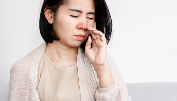 Đau vùng mặt và đầu: Cảm giác nặng vùng trán, hốc mắt hoặc đau nhức dọc sống mũi.