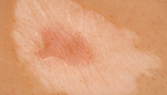 Mảng da trắng: Các vết đốm màu trắng sáng, bóng, sau đó lan rộng thành các mảng lớn. Da trông mỏng và nhăn nheo giống như giấy nhám.