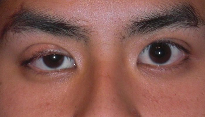 Sụp mi mắt: Mí mắt trên rủ xuống che khuất một phần hoặc toàn bộ nhãn cầu mắt.