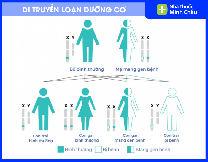 Di truyền liên kết giới tính X: Thường gặp ở thể Duchenne và Becker. Gen lỗi nằm trên nhiễm sắc thể X, nên bệnh chủ yếu biểu hiện ở nam giới, trong khi nữ giới thường là người mang gen nhưng ít có triệu chứng.