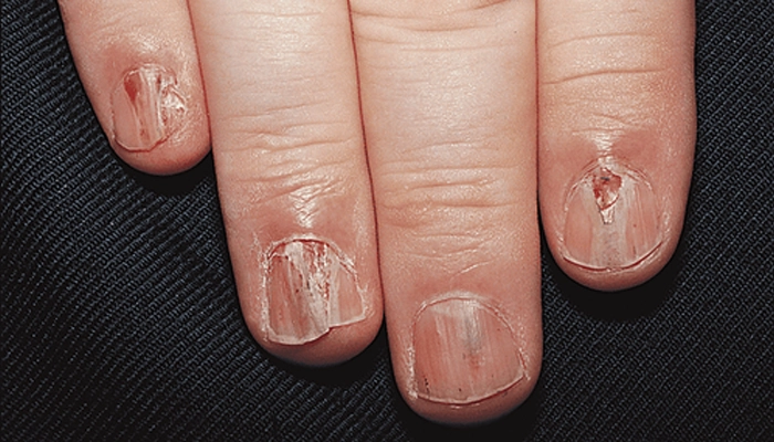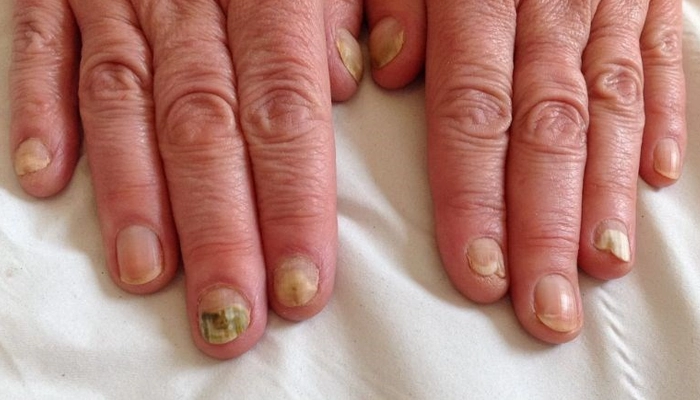 Vảy nến móng: Gây ra hiện tượng móng rỗ, tách móng và có các vết "giọt dầu" màu vàng cam dưới móng.