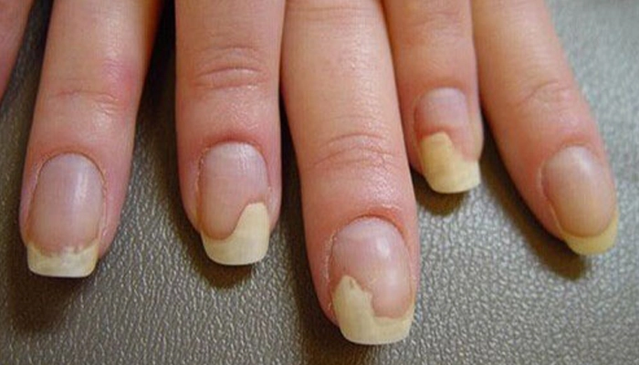 Tách móng (Onycholysis): Phần thân móng bị tách rời khỏi giường móng, tạo khoảng trống màu trắng hoặc vàng phía dưới.