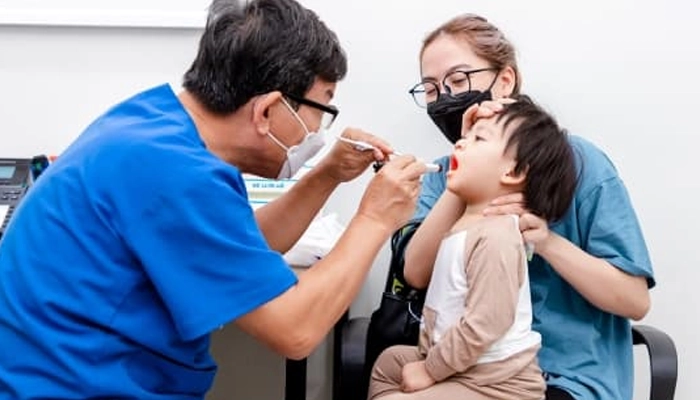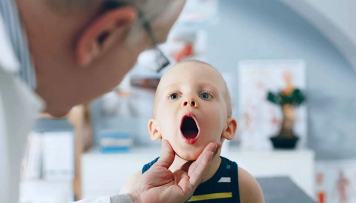 Với trẻ lớn hơn, bé có thể chỉ tay vào cổ và nói đau khi nuốt.