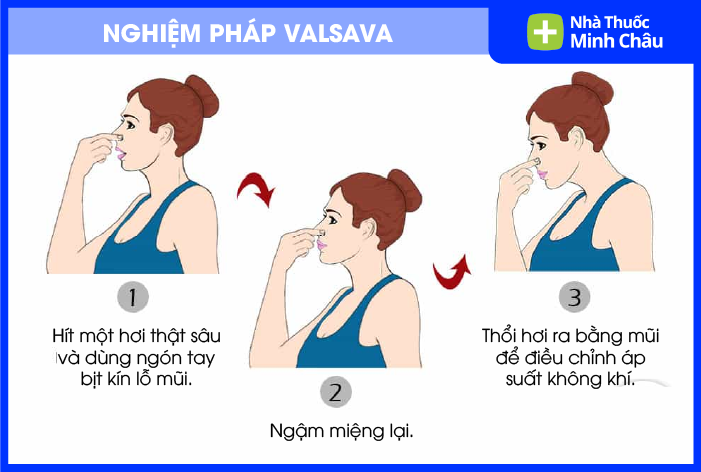 Cách làm: Ngậm miệng, dùng tay bịt chặt hai lỗ mũi. Sau đó, cố gắng thở ra bằng mũi một cách nhẹ nhàng (nhưng vì mũi đã bị bịt nên không khí sẽ bị đẩy lên vòi Eustache).