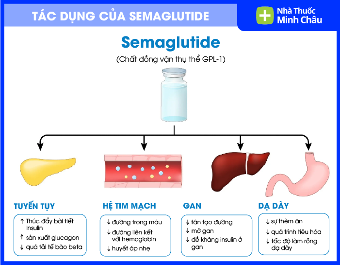 Kích thích tuyến tụy tiết insulin: Khi đường huyết tăng sau ăn, Semaglutide khiến tuyến tụy tiết insulin nhiều hơn, giúp giảm đường máu.