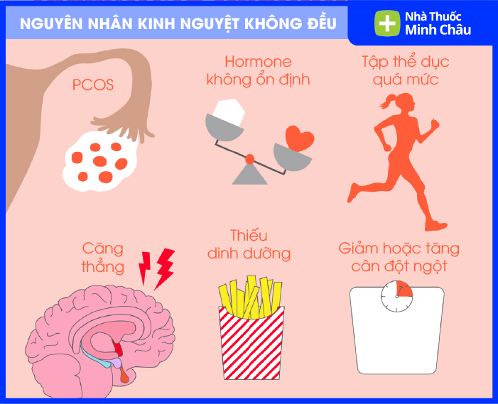Kinh nguyệt không đều có thể do yếu tố sinh lý (stress, thay đổi cân nặng, dậy thì, tiền mãn kinh) hoặc bệnh lý tiềm ẩn (buồng trứng đa nang, rối loạn tuyến giáp, u xơ tử cung, lạc nội mạc tử cung...).