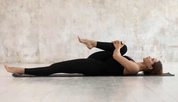 Kéo đầu gối phải về phía ngực, giữ 15–20 giây.
