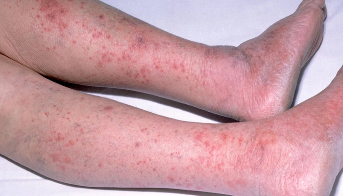 Tử ban (Vết thâm): Xuất hiện các nốt đỏ tím trên da, không biến mất khi dùng tay ấn.