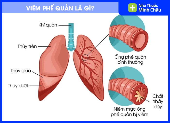 Viêm phế quản là tình trạng viêm niêm mạc ống phế quản – hệ thống đường dẫn khí nối từ khí quản vào phổi. Khi niêm mạc bị viêm, nó sẽ sưng nề và tăng tiết dịch nhầy, làm hẹp lòng phế quản. Hậu quả là không khí lưu thông kém, gây ho nhiều, khạc đờm, thở khò khè và khó thở.