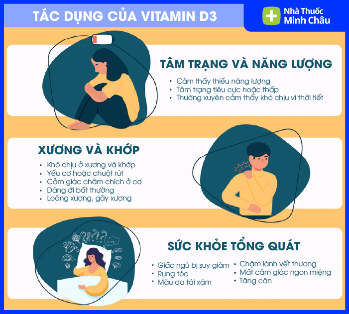 Công dụng quan trọng nhất của vitamin D3 là tăng cường khả năng hấp thu canxi và phốt pho tại ruột non, giúp xương và răng chắc khỏe. Nếu thiếu vitamin D3, dù bạn có bổ sung canxi nhiều đến đâu, cơ thể vẫn không hấp thu tốt, dẫn đến loãng xương, đau nhức xương, gãy xương dễ dàng.