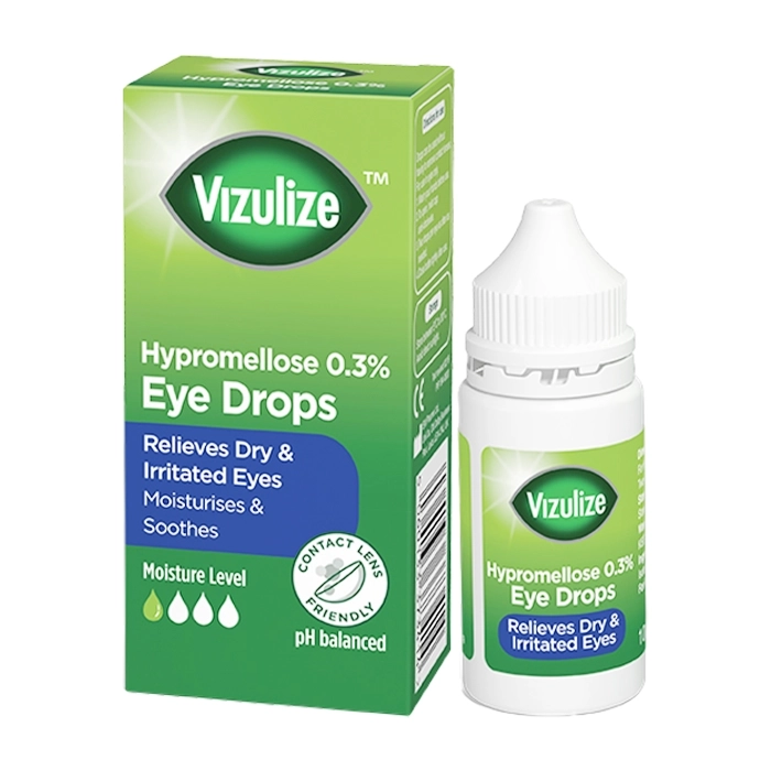 - Thuốc nhỏ mắt Vizulize Hypromellose 0,3% cũng có thể giảm thiểu sự khó chịu hoặc cộm ở mắt do môi trường xung quanh bạn gây ra – cho dù đó là do tiếp xúc với điều hòa không khí, hệ thống sưởi trung tâm, môi trường nóng hoặc gió hoặc ô nhiễm.