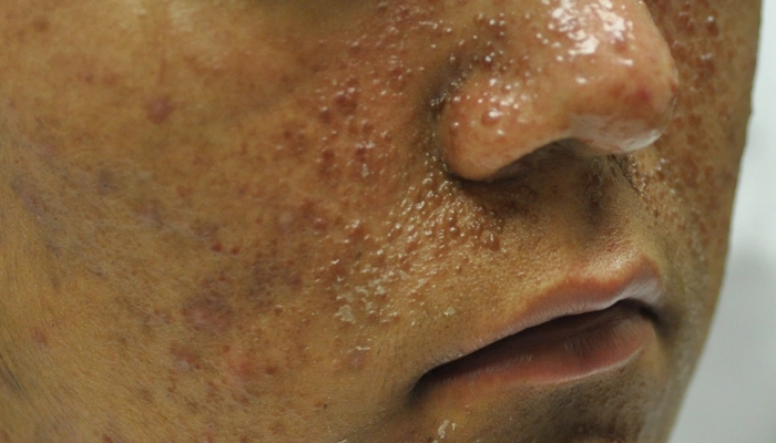 Hình ảnh tổn thương da trong bệnh xơ cứng củ, xuất hiện các cục mụn nhỏ màu đỏ hồng tập trung trên mũi và hai bên má