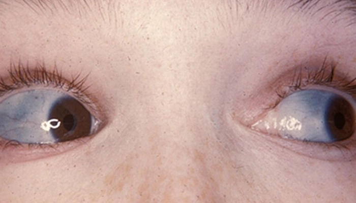 Củng mạc mắt màu xanh: Do lớp củng mạc mỏng làm lộ ra các mạch máu phía dưới.